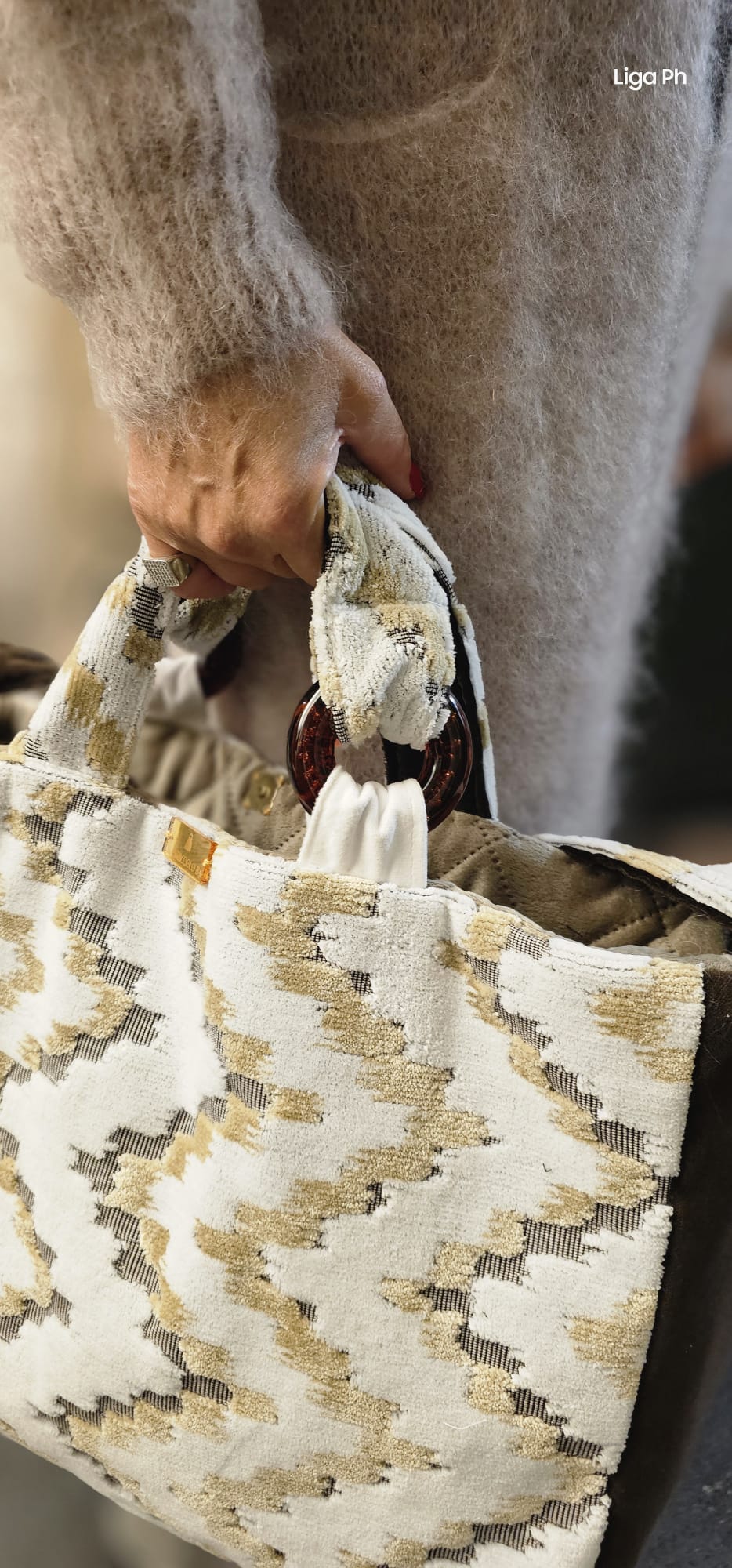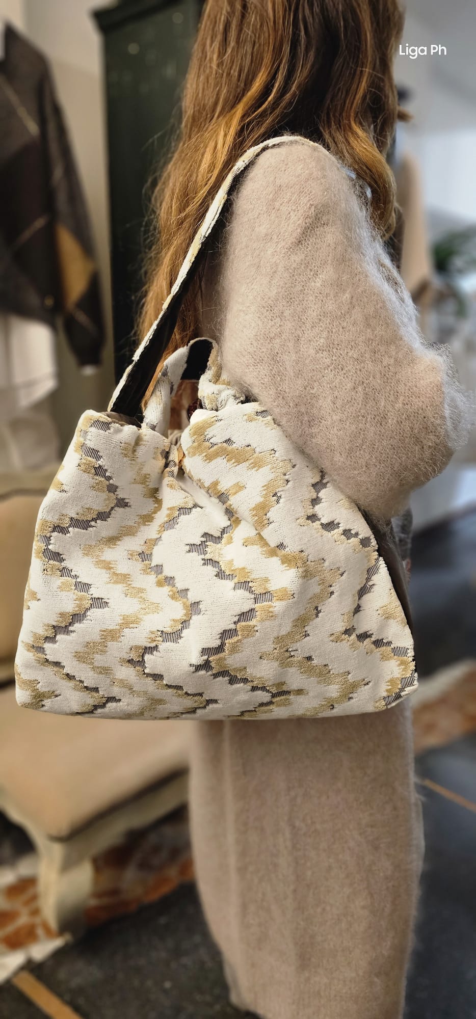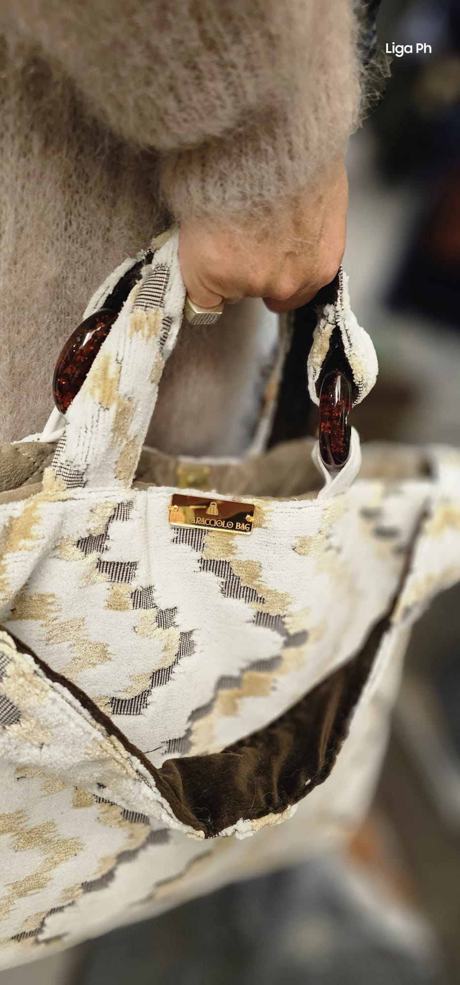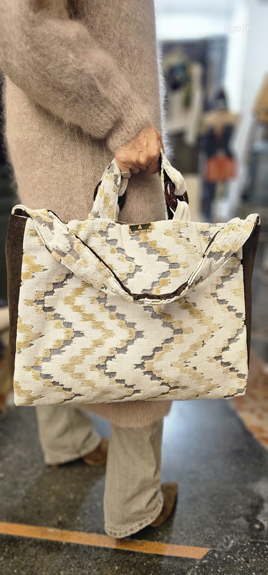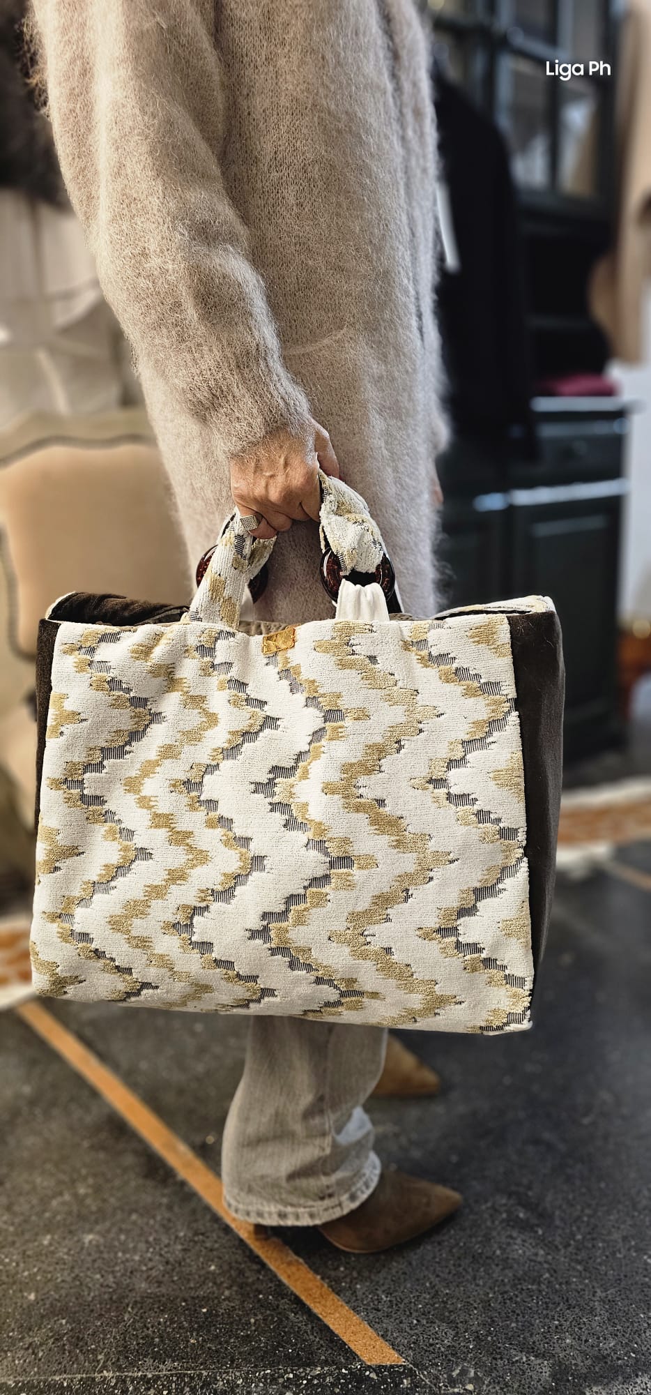 Shopperchic in velluto damascato bianca con laterali in velluto marrone munita di manici e tracolla con inserti a cerchio di resina tartarugati