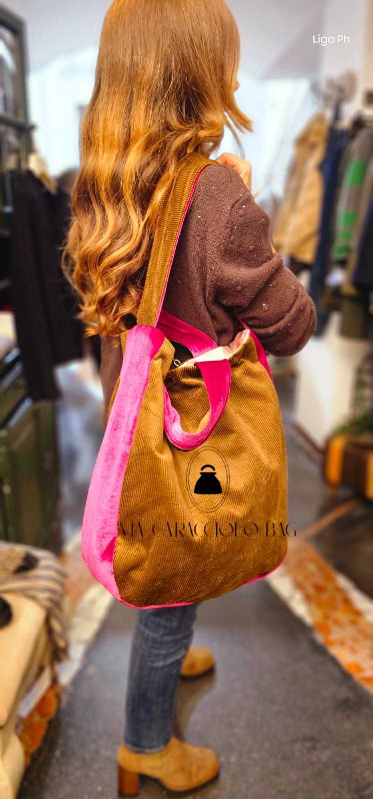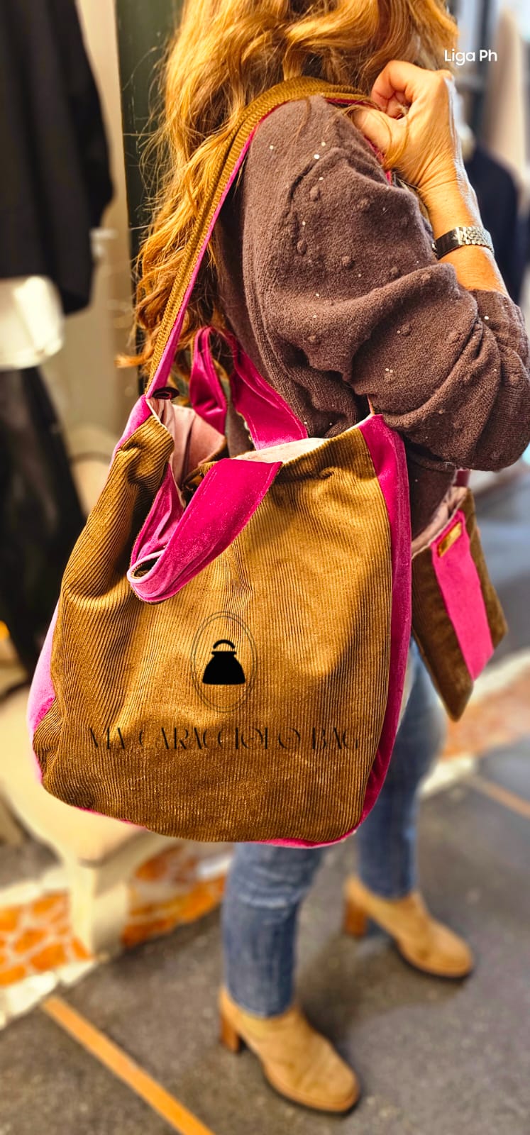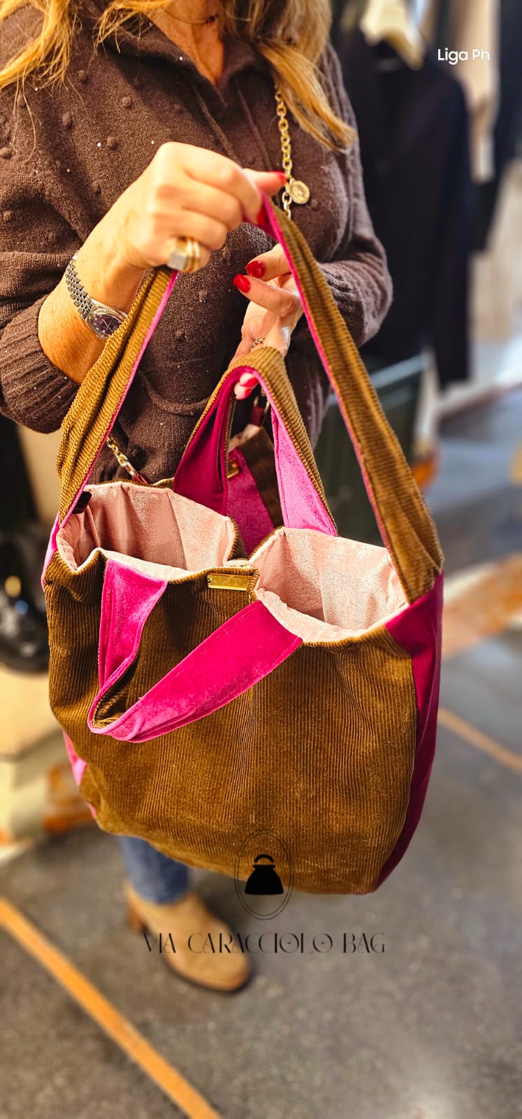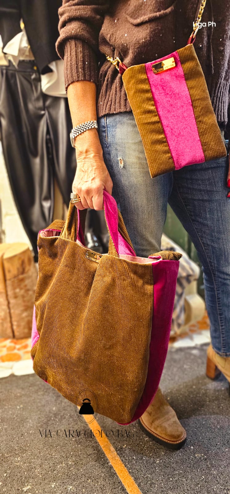 Shopperchic in velluto nocciola a coste con banda laterale velluto liscio color ciclamino interno velluto rosa