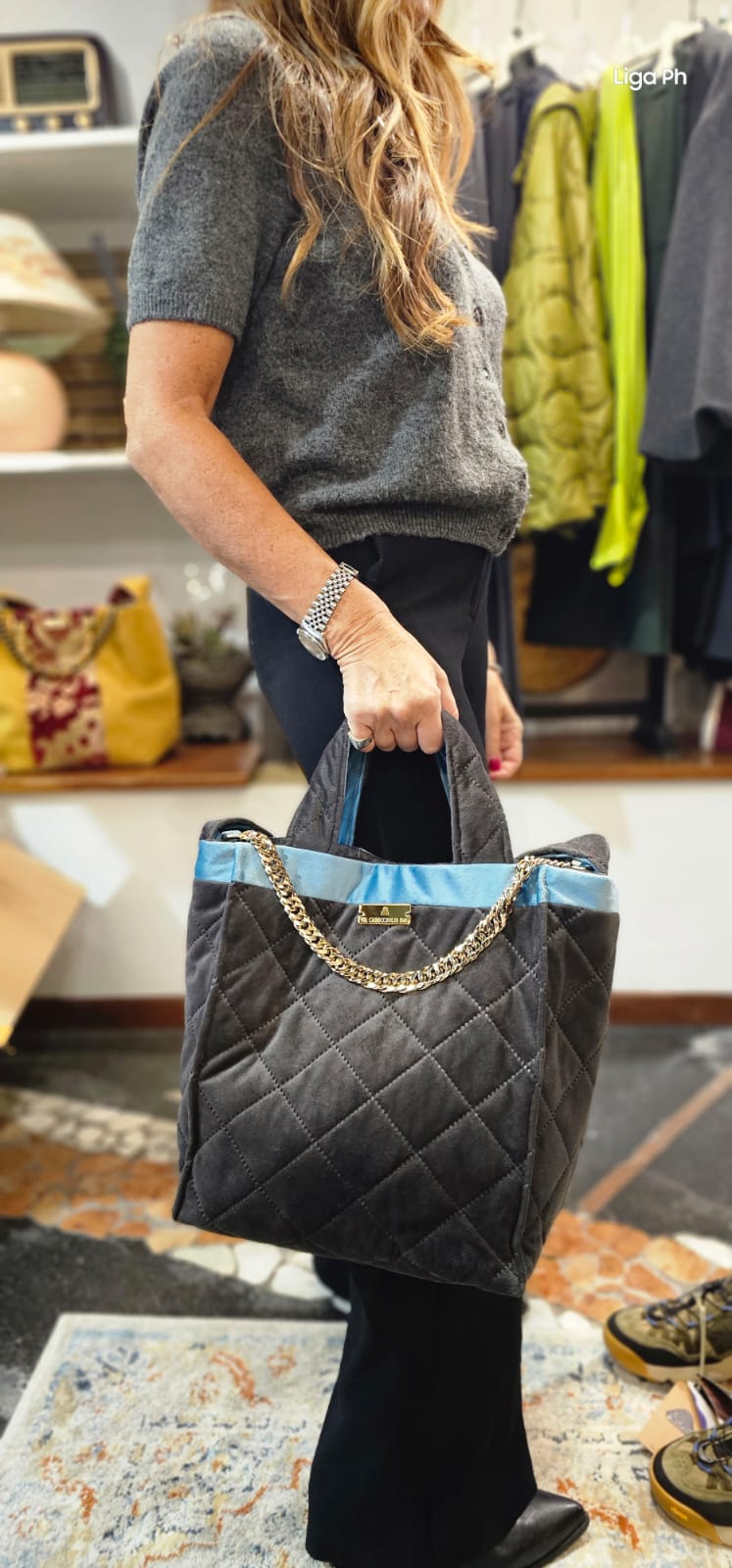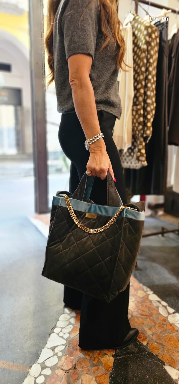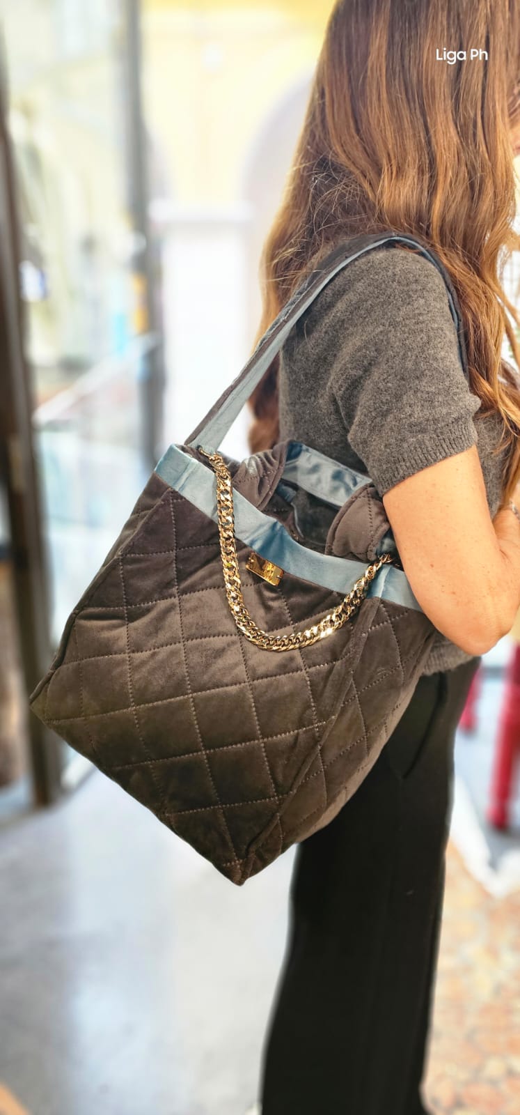 Shopperchic in velluto trapuntato grigio con bordo velluto celeste polvere munita di catena gioiello dorata galvanizzata