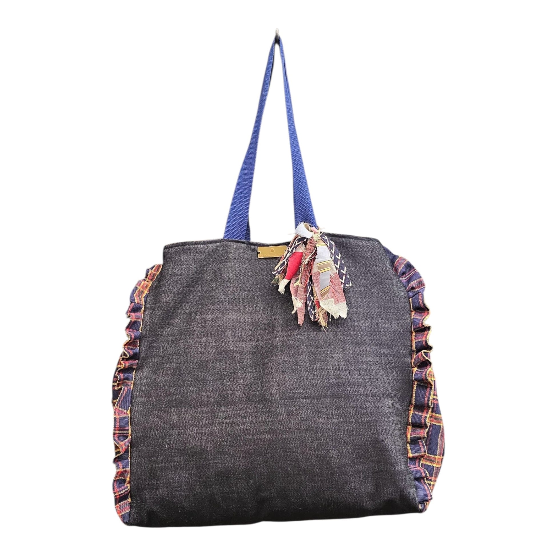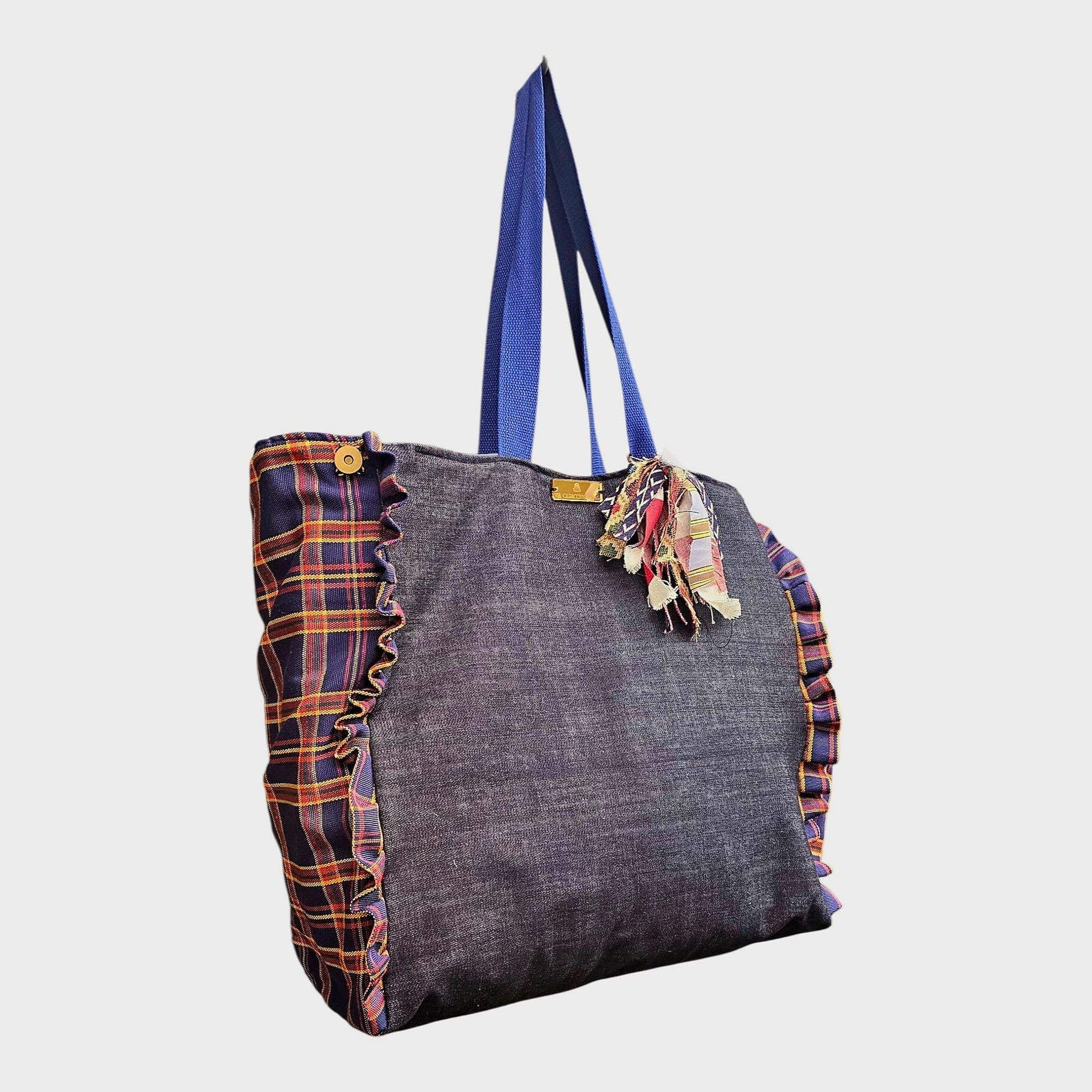 Shopperchic in jeans con laterali in cotone scozzese....capiente leggera versatile munita di nappina sartoriale