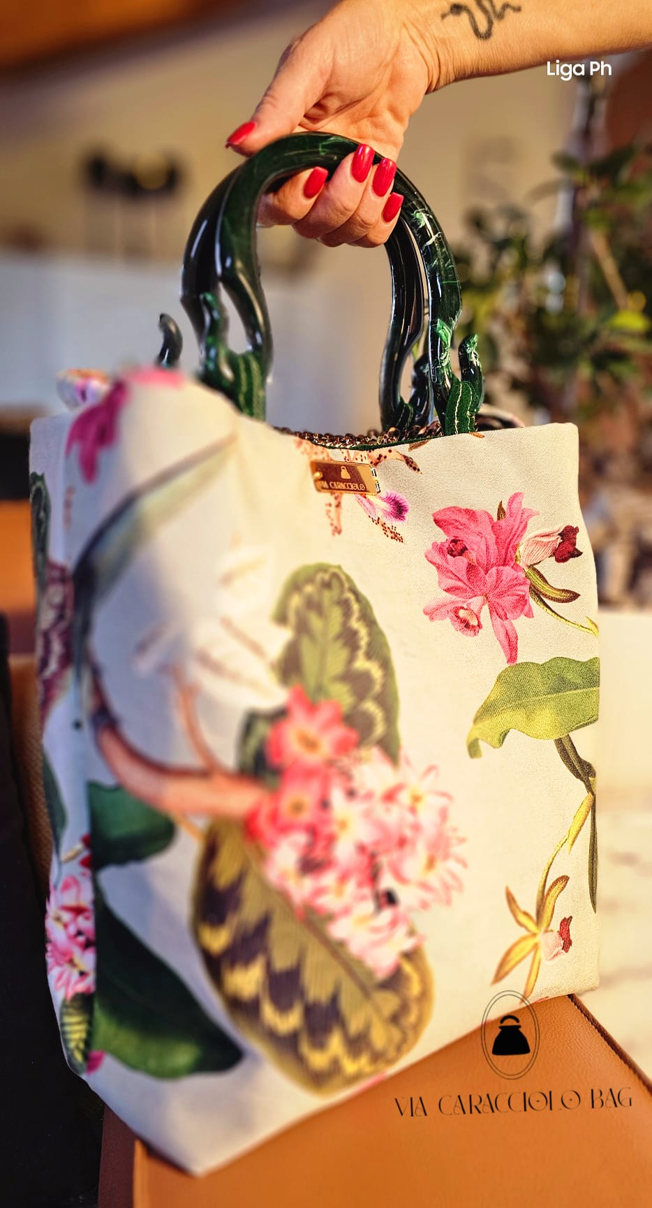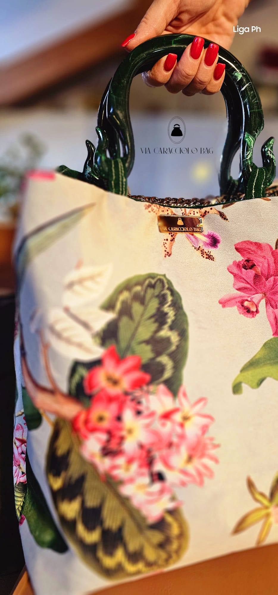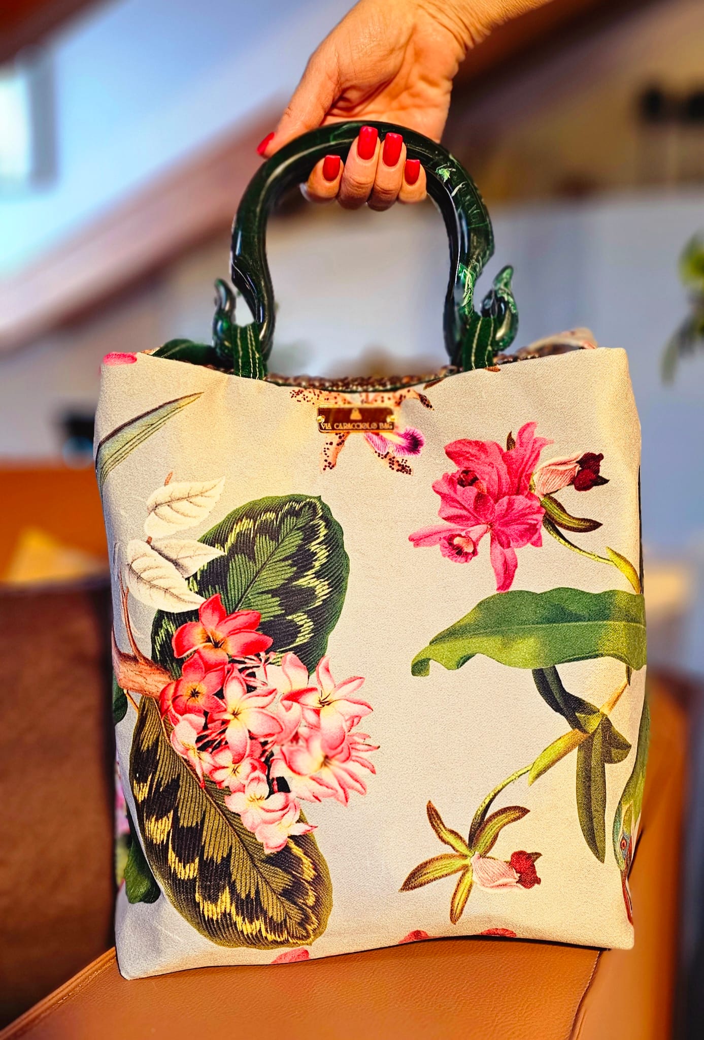 Shopperchic in velluto fantasia munita di manici verdi e aggancio catena gioiello dorato galvanizzato
