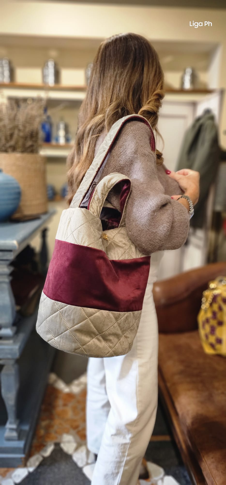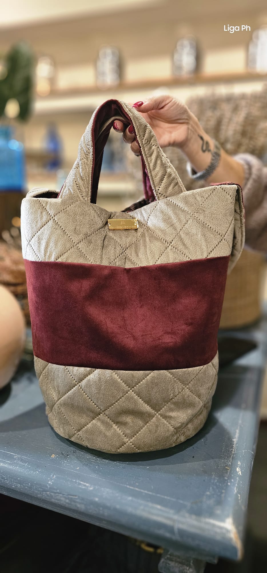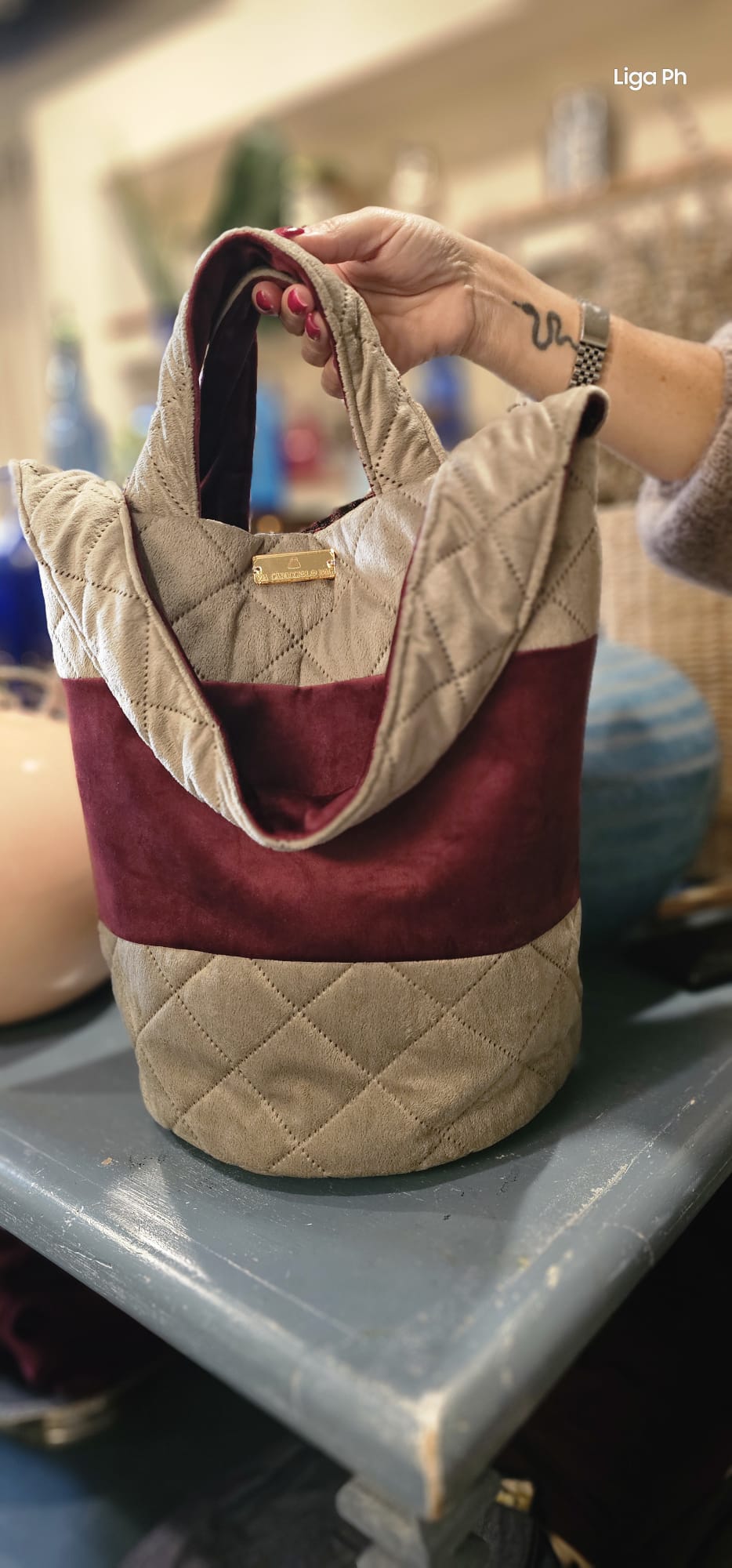 Secchiello in velluto trapuntato color tortora con banda velluto bordeaux