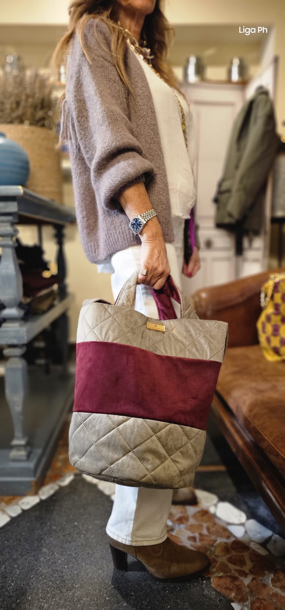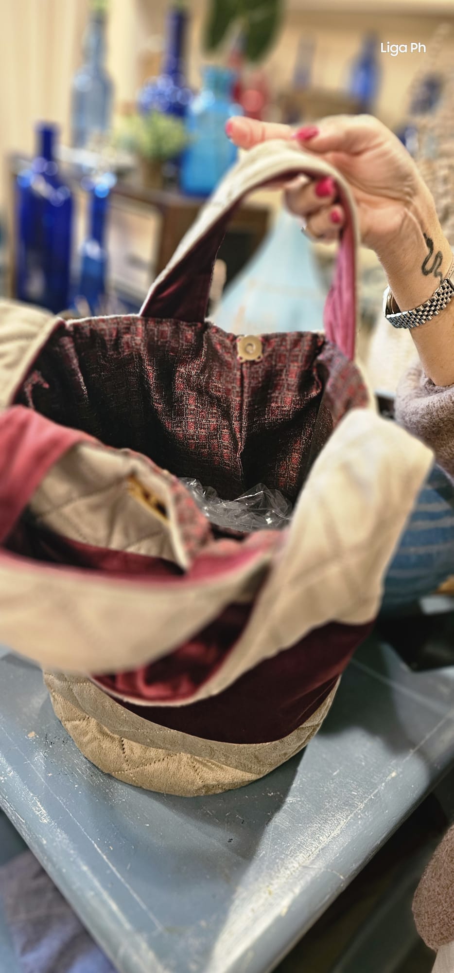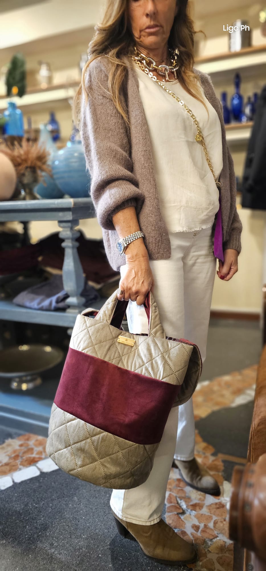 Secchiello in velluto trapuntato color tortora con banda velluto bordeaux