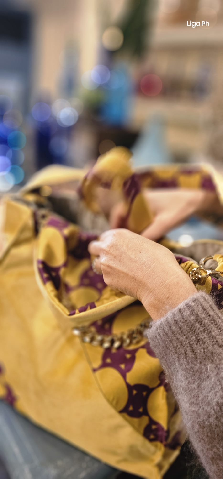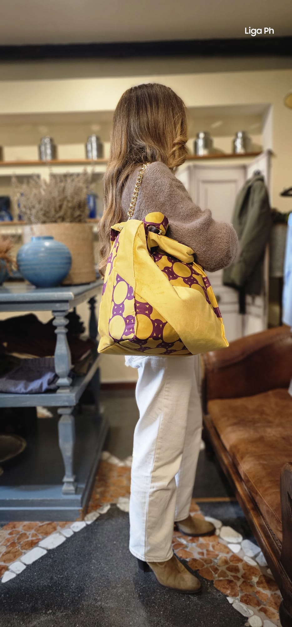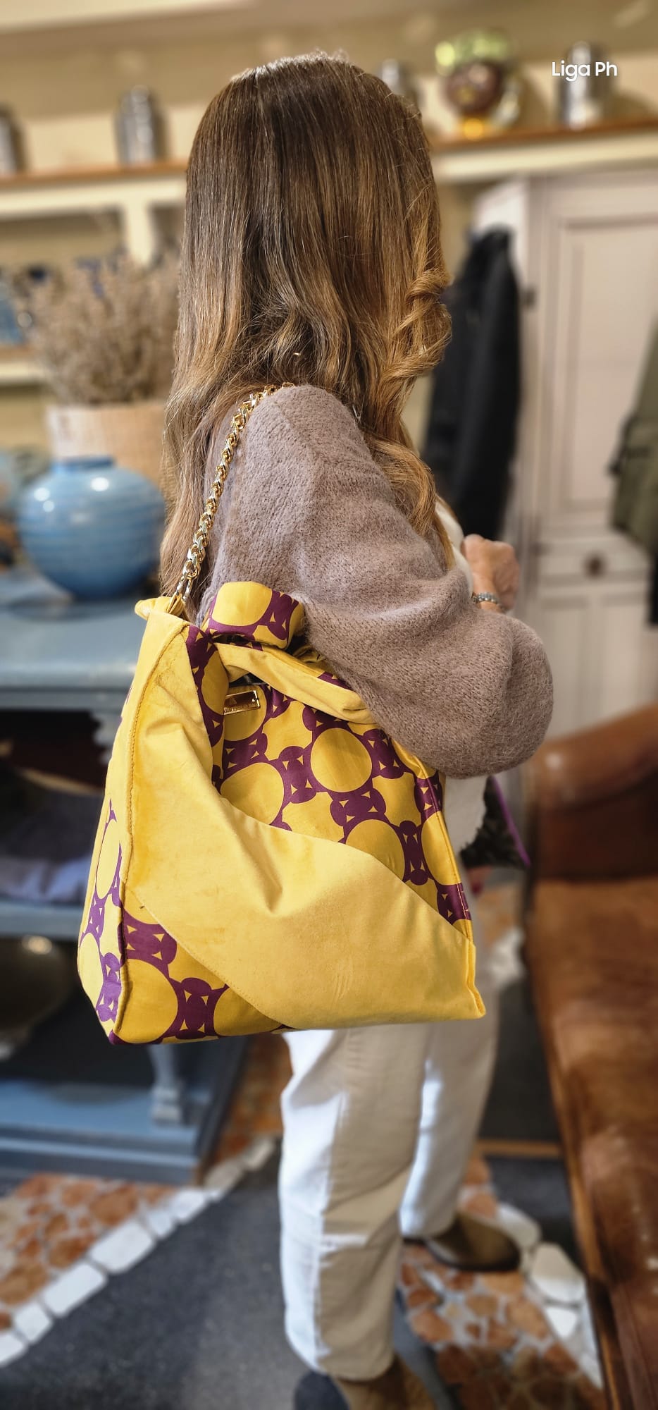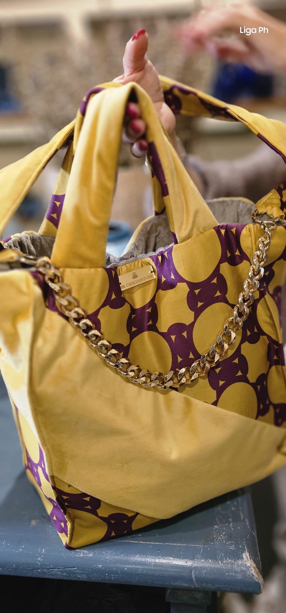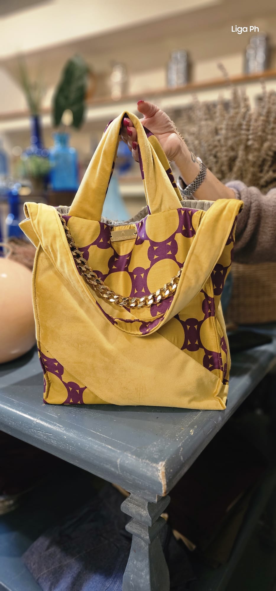 Shopperchic in velluto giallo senape e tessuto fantasia giallo e prugna munita di catena gioiello dorata galvanizzata