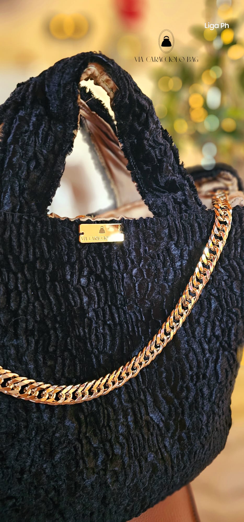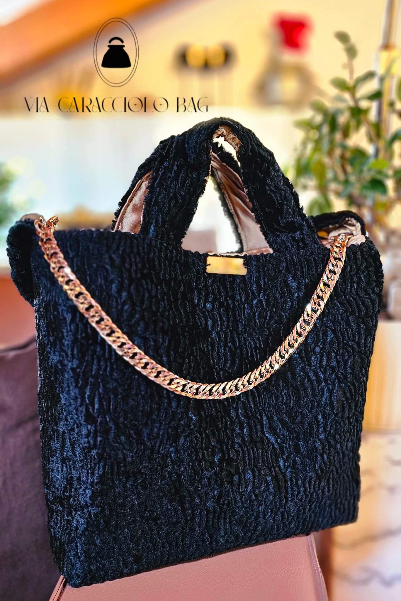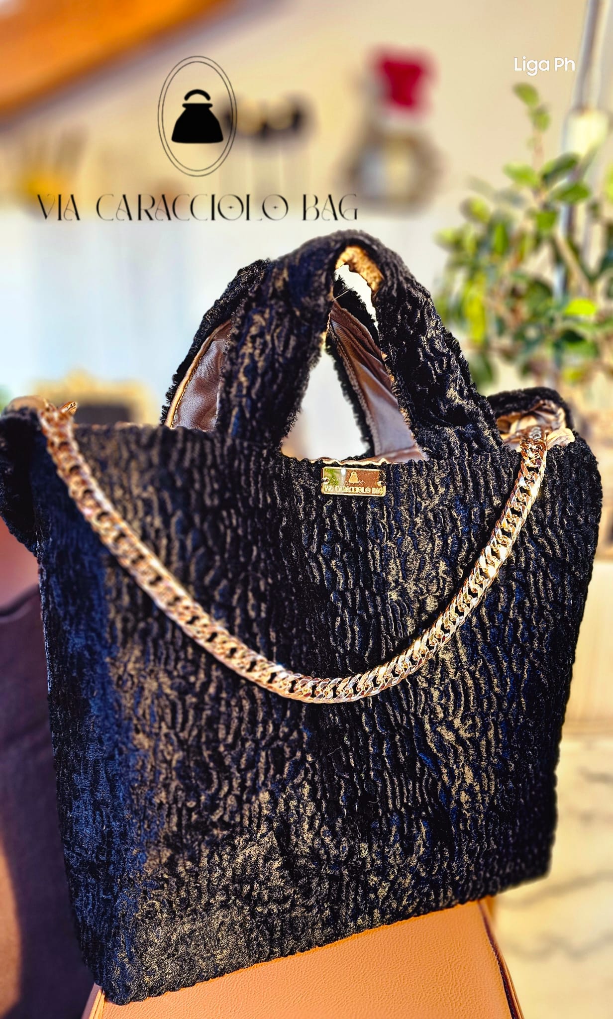 Shopperchic in eco astrakan nero foderata in mikado beige dorato munita di pregiata catena gioiello dorata galvanizzata