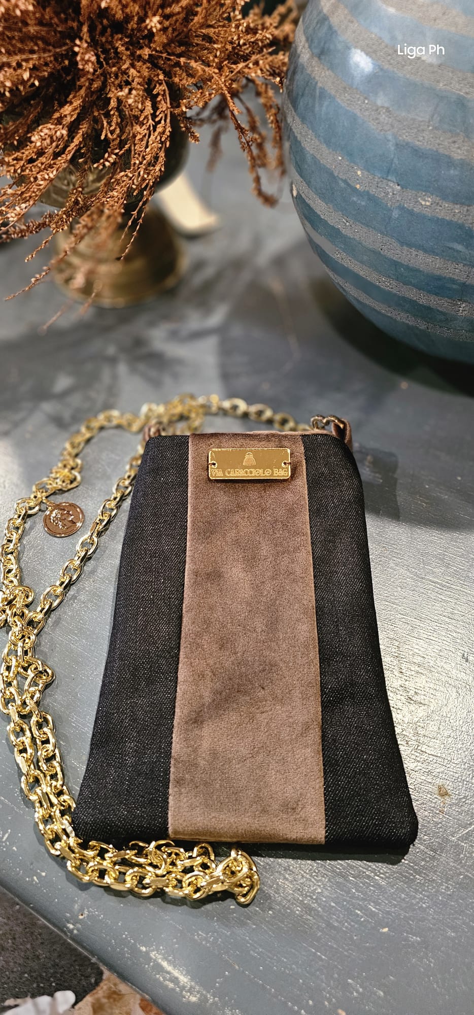 Caracciolina portacellulare in tessuto jeans e velluto marrone munita di catena gioiello con pendente moneta