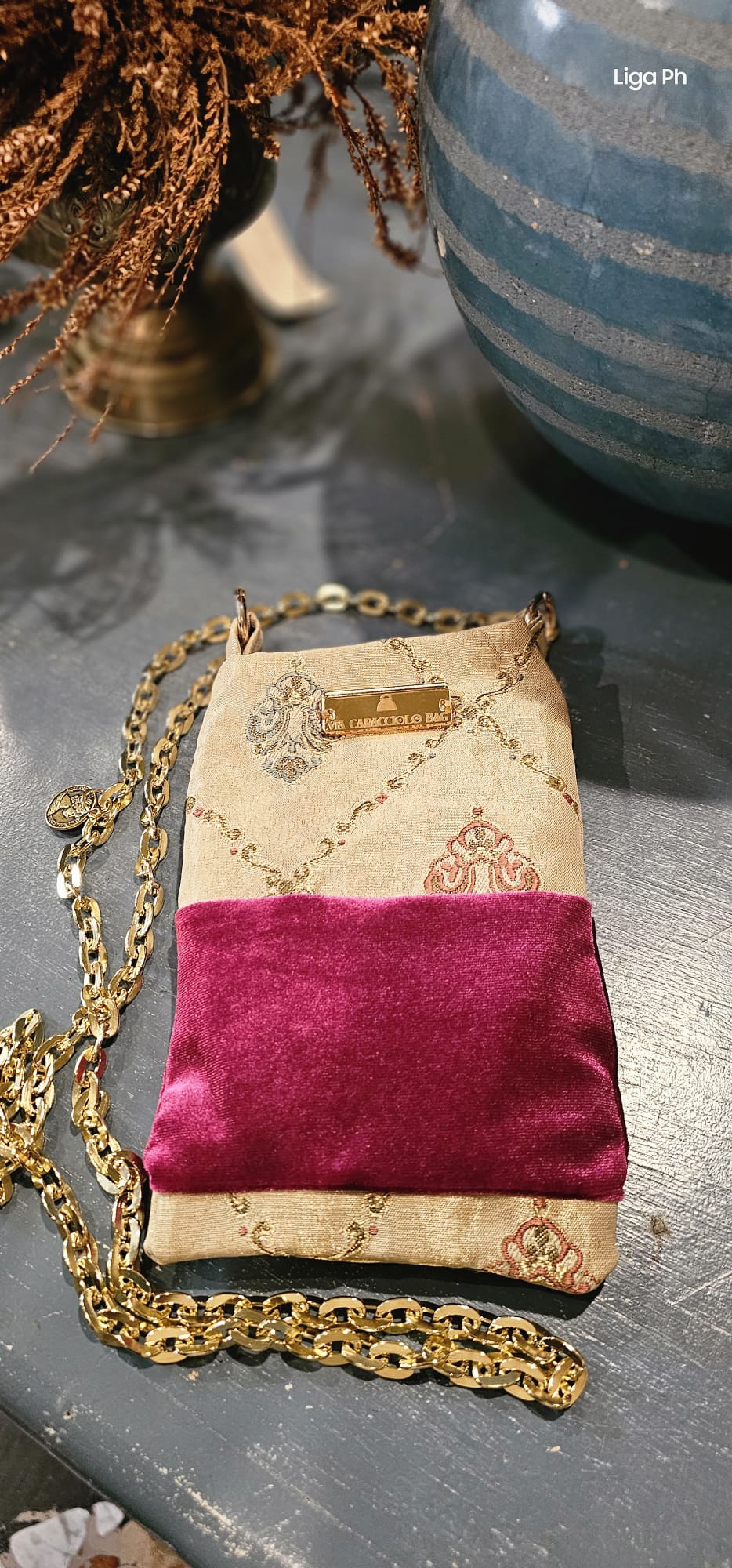 Portacellulare in tessuto dorato San leucio e velluto on seta color ciclamino