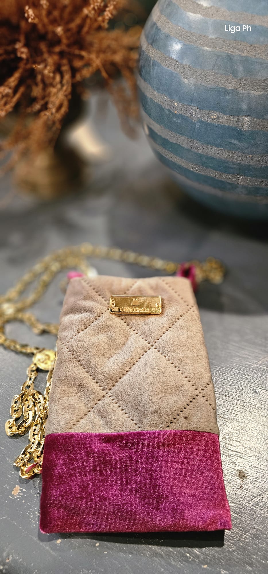 Portacellulare in velluto trapuntato color tortora con fascia velluto color ciclamino