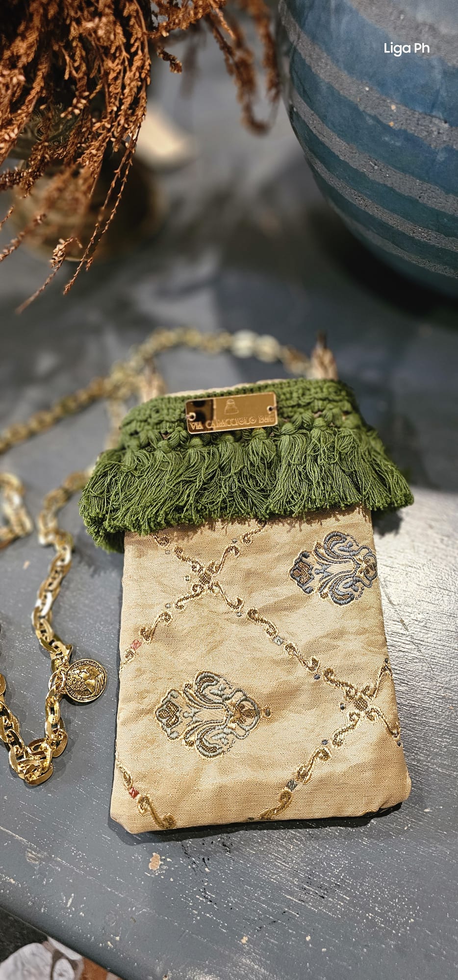 Portacellulare in tessuto damascato dorato San leucio con nappine verdi