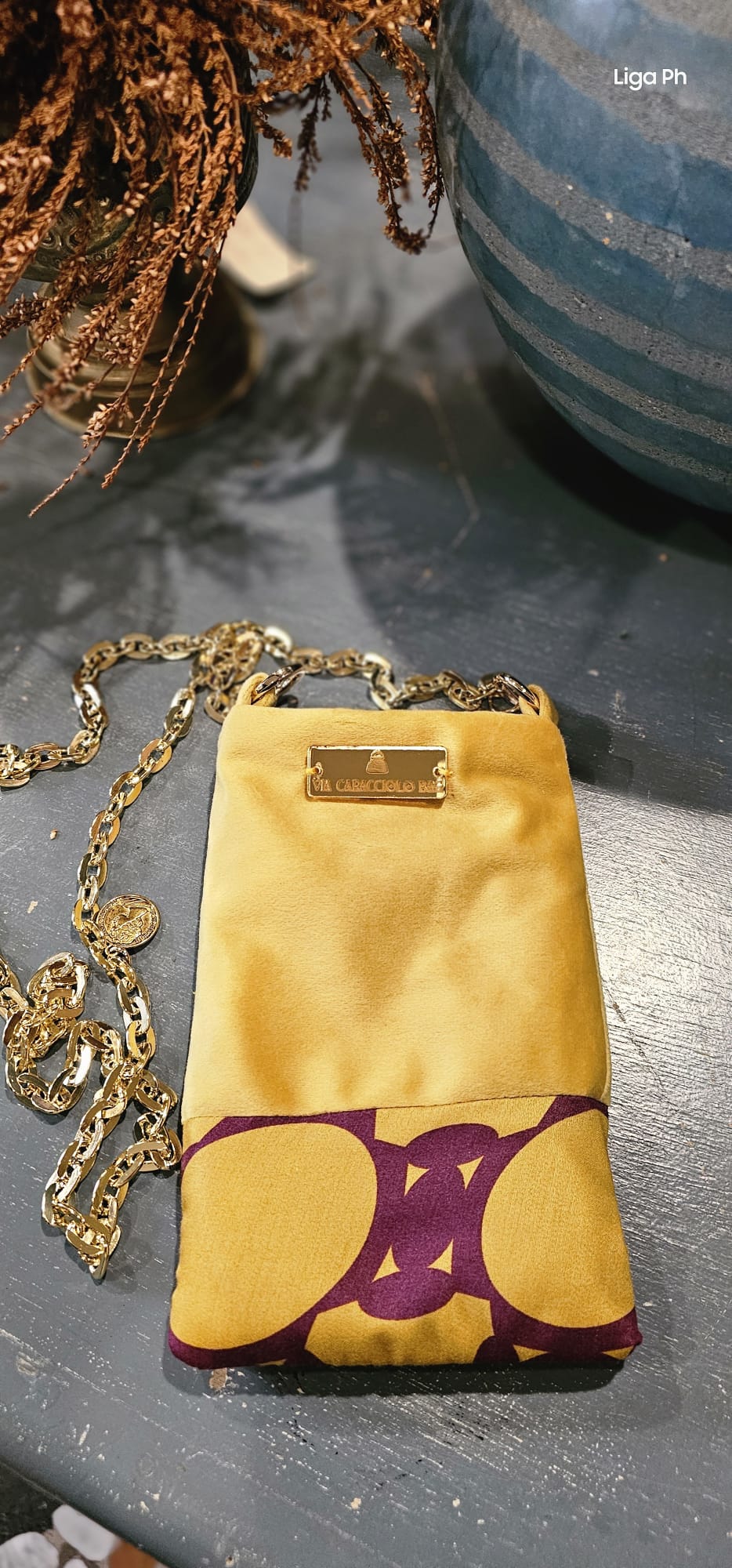Portacellulare in velluto color giallo senape e fantasia color prugna