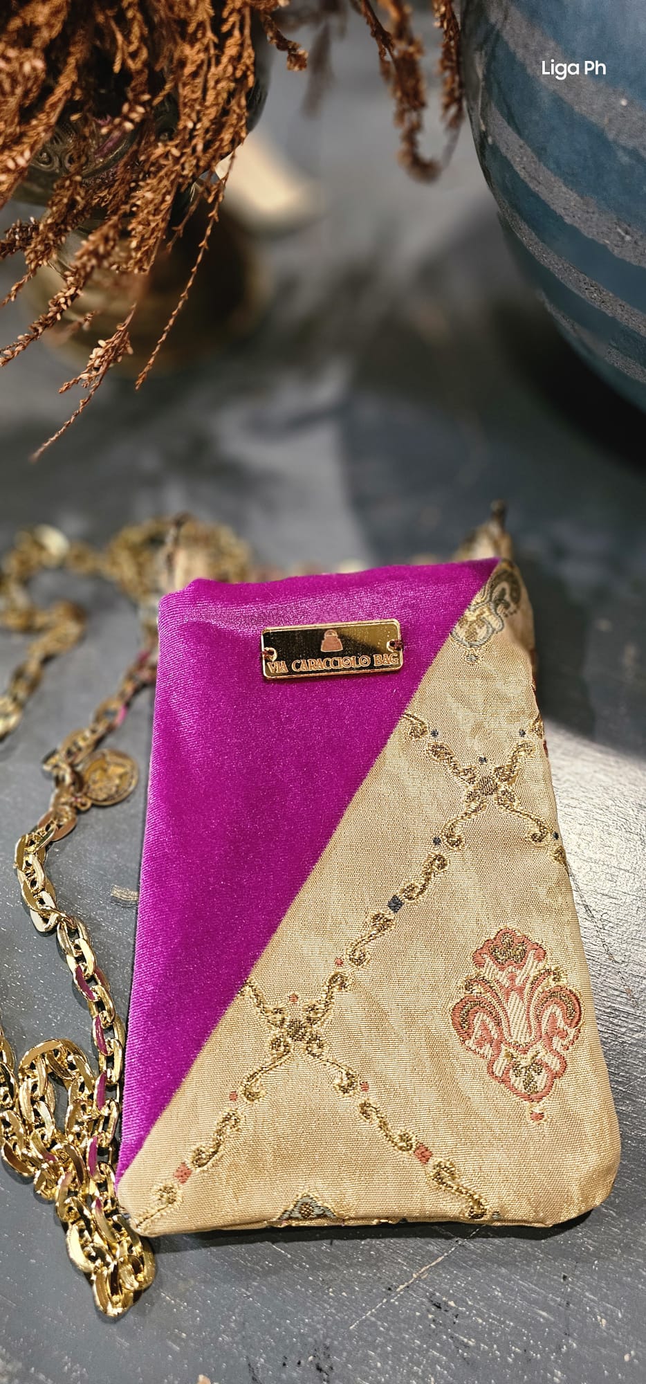 Portacellulare velluto color ciclamino e damascato dorato