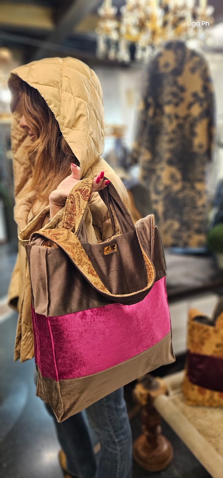 Shopperchic in velluto marrone con banda velluto ciclamino foderata in damascato fantasia etro