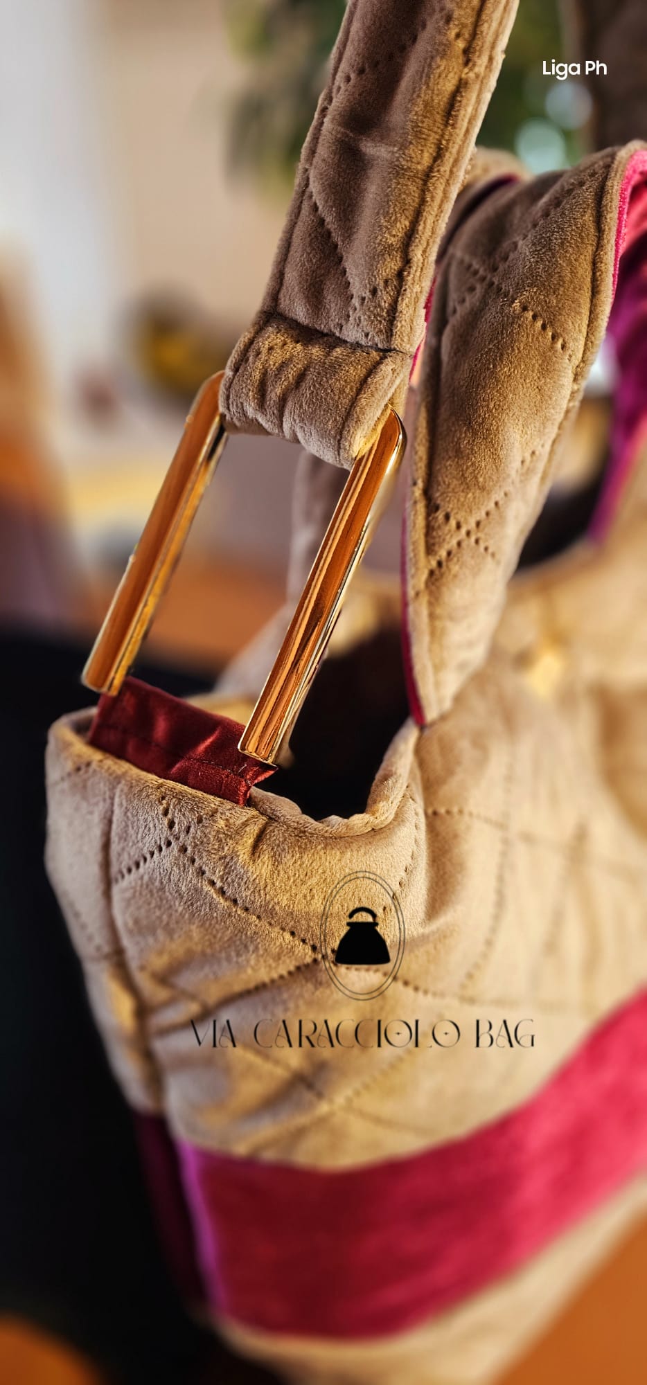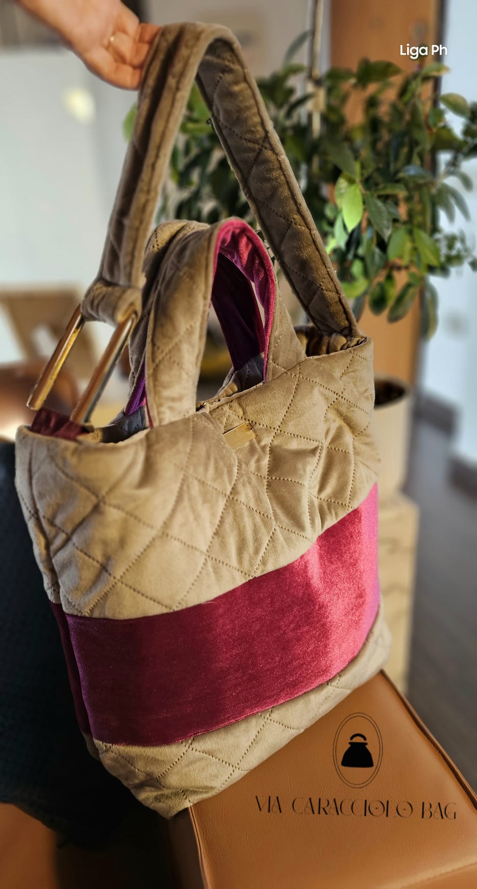 Shopperchic in velluto trapuntato color tortora con banda ciclamino munita di fibra gioiello dorata sulla tracolla