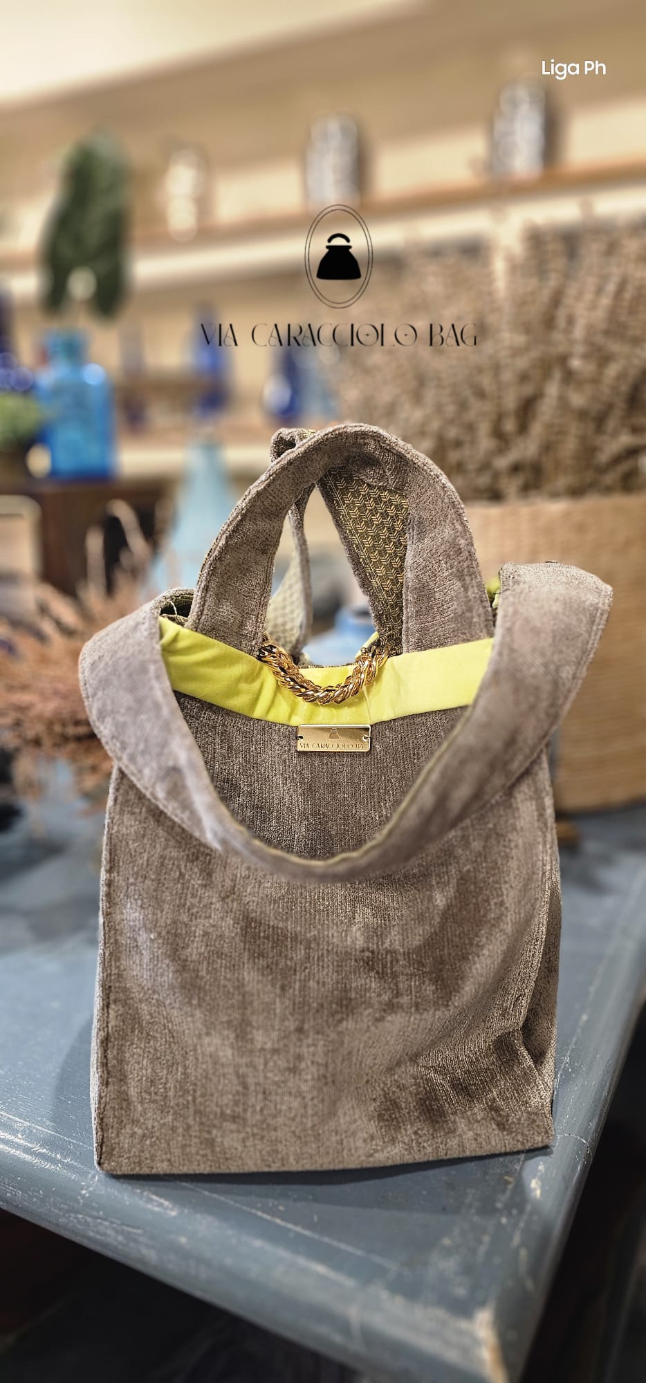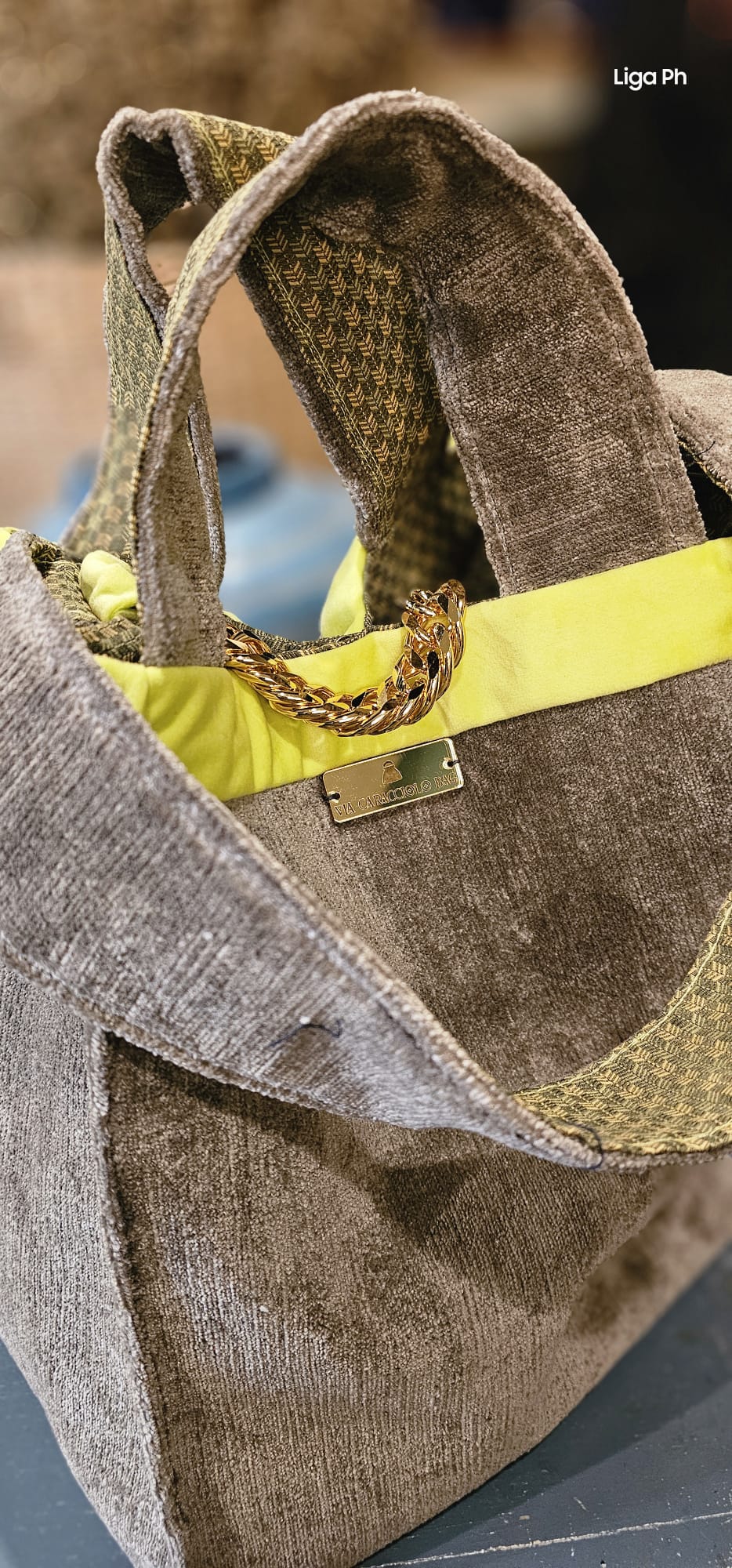 Shopperchic in velluto antico grigio con bordino in velluto color verde fluo munita di catena gioiello dorata galvanizzata